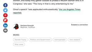 This story chooses another angle to write about Trump attitude towards the New Zealand attack. The author chooses IIhan Omar, a Muslim leader, as the main character of the story and this report angle add the details of the ‘discussion part’ which story one lack of. It has high scannability. This news has a clear structure and clarified summary. It first shows the position and opinion of the Muslim leaders and then the reaction of Trump and the White House, this causes a contrast that could attract readers. While there are several hyperlinks to provide further information about the story and the quantity is larger than the Washington Post, there are some unnecessary links. The links of ‘Kellyanne Conway’ send users to the HuffPost page with all her related news. This distracts readers’ attention from the current story to the others. Otherwise, HuffPost has story sharing links through social media icons on the left side and also keyword tags, which are what the Washington Post lack.